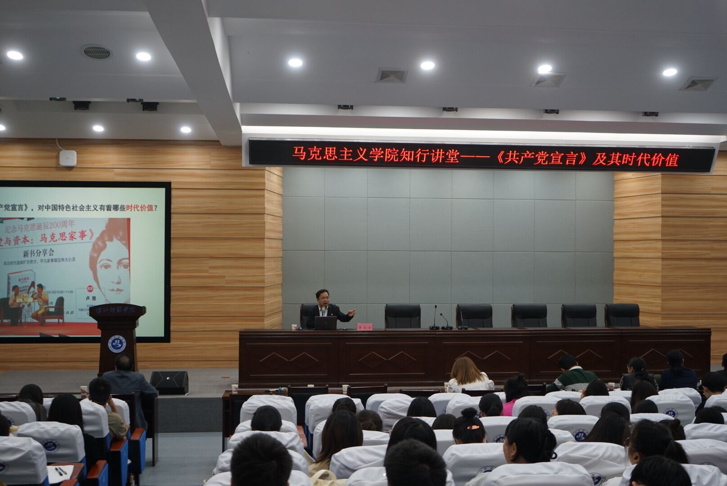 鲁博士从《共产党宣言》的写作背景、主要内容、时代价值三个方面展开阐述。讲授语言生动,重点突出,不时穿插党史故事、视频短片,深入浅出的为师生们阐述了宣言的内容、理论意义和时代价值。同时,以互动问答的方式引发在场学子深入思考,会场气氛活跃。