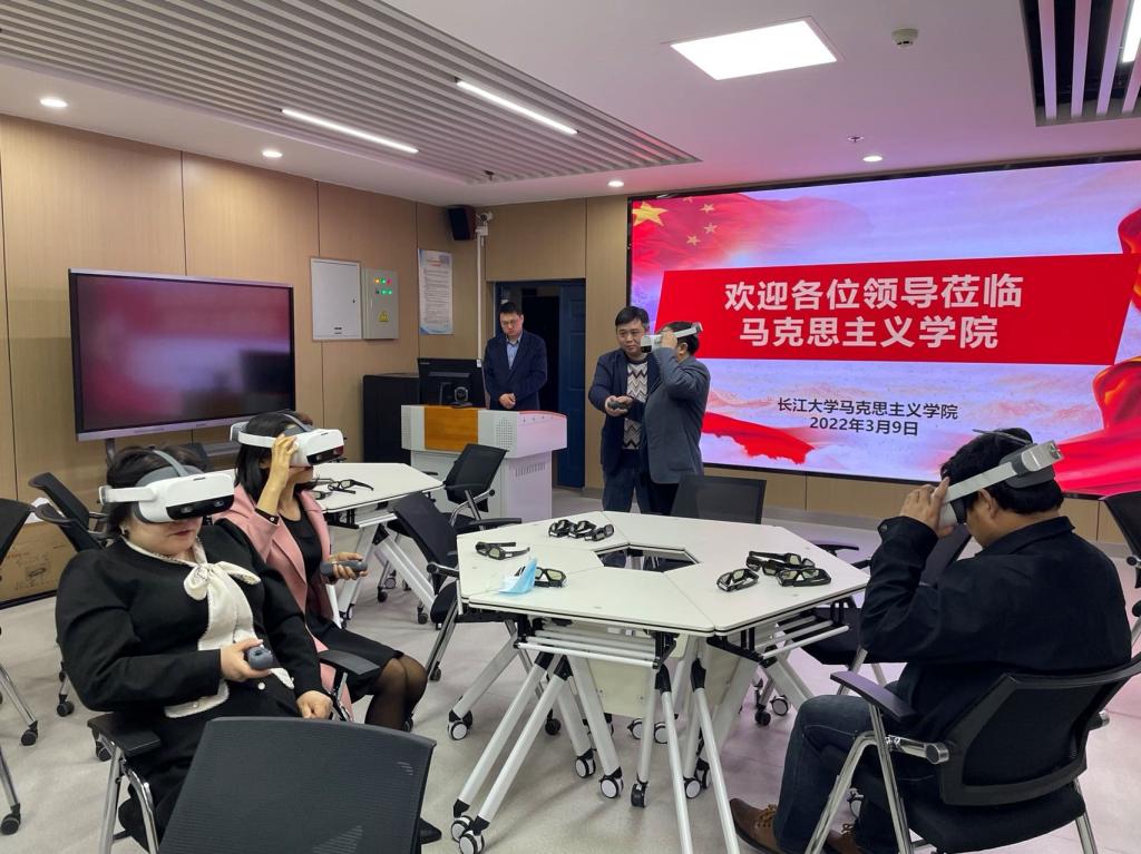在长江大学威廉希尔williamhill,党家政一行详细了解了该公司建设发展情况、招生规模、办学经费、绩效考核、专业建设、课程改革、人才培养、实训中心建设和基层党建等,观看了国家一流课程《生命长江》,双方就团队队伍建设、课程和专业建设、虚拟仿真实验室建设、提升本科生考研率等进行了深入交流。参观了长江大学威廉希尔williamhill虚拟仿真实验室,了解了思政课虚拟体验空间建设情况,现场亲身体验了 “长征史诗”中的“爬雪山”“过草地”等虚拟场景实践教学活动,感受将沉浸式VR技术与具有思政教育内容的虚拟仿真场景相融合的实践教学模式。