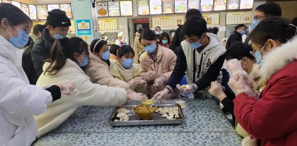 座谈会后,大家前往麦馨园食堂二楼进行包饺子活动。师生协力,在餐桌上“大展身手”,一盘又一盘形态各异的饺子从师生们的手中诞生。最后,大家在轻松愉悦的氛围中共进晚餐。