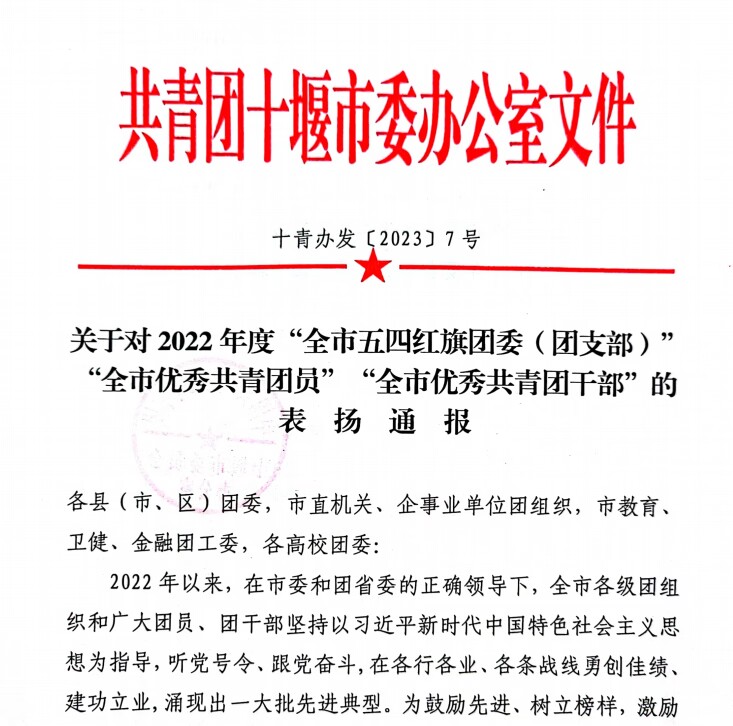 近日,团市委公布了2022年度全市五四红旗团委(团支部)等先进集体和个人名单。其中,威廉希尔williamhill团总支获得市级表彰。
