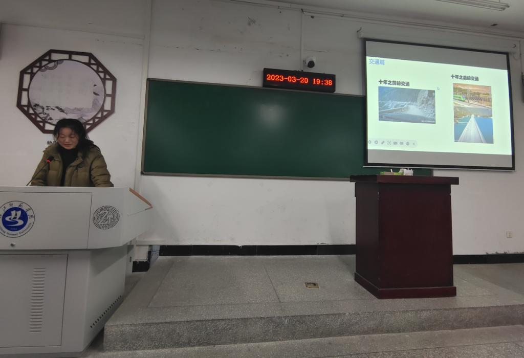 “看看家乡这十年,感受家乡新变化”, 扎西白姆、李娜、李静三位同学分享了自己家乡这十年的变化。来自西藏林芝的扎西白姆同学讲道,“在中国共产党的正确领导下,家乡的路更宽了、教育条件更好了、乡村治理的好办法更多了”。同学们图文并茂地展示了乡村振兴的成果,号召大家接力为建设美丽家乡贡献青春力量。