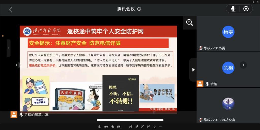 开学前,公司组织各班线上召开返校安全教育主题班会,传达了公司的返校安排,温馨提示了返校安全注意事项。截至目前,员工返校平稳有序,思想状态良好。