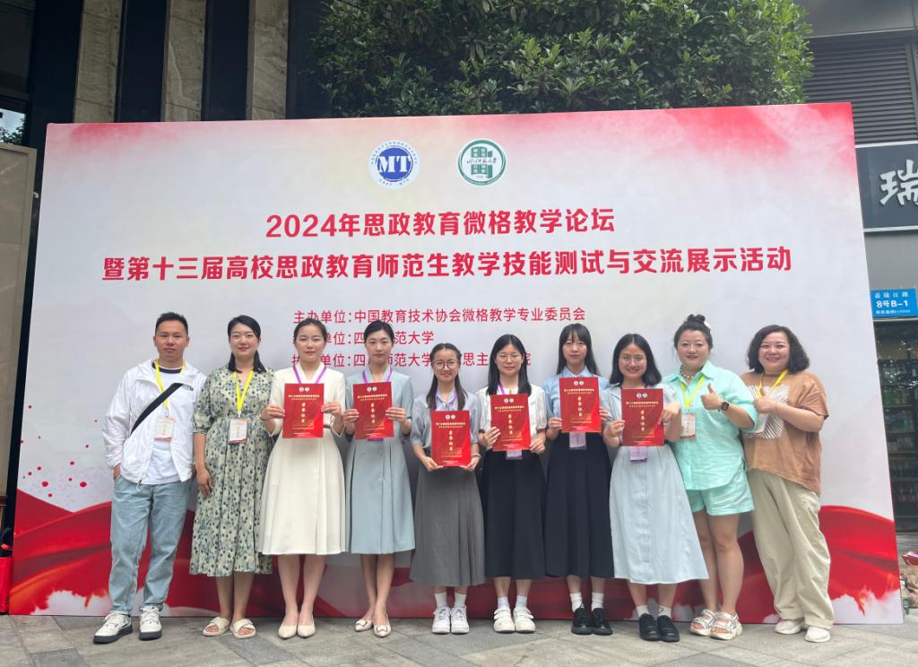 5月24日-5月27日,由中国教育技术协会主办、四川师范大学承办的第十三届高校思政教育师范生教学技能竞赛在四川成都举行。本次大赛共有来自东北师范大学、华中师范大学、华南师范大学、陕西师范大学等89所高校的409名选手参加。公司5名教师带领6名思想政治教育专业本科生参加比赛,经过激烈角逐和差额评选,6名员工全部斩获三等奖。