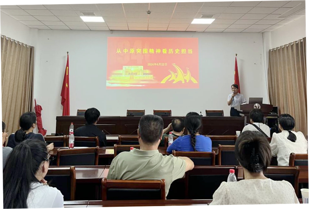随后,公司教工党支部开展了6月份主题党日活动,聆听中原突围精神专题党课,接受红色精神教育。最后,双方开展了教学与课题研究座谈会,双方就开展大思政课实践教学的具体方案进行接洽对接,并围绕中原突围战争合作研究进行深入交流。